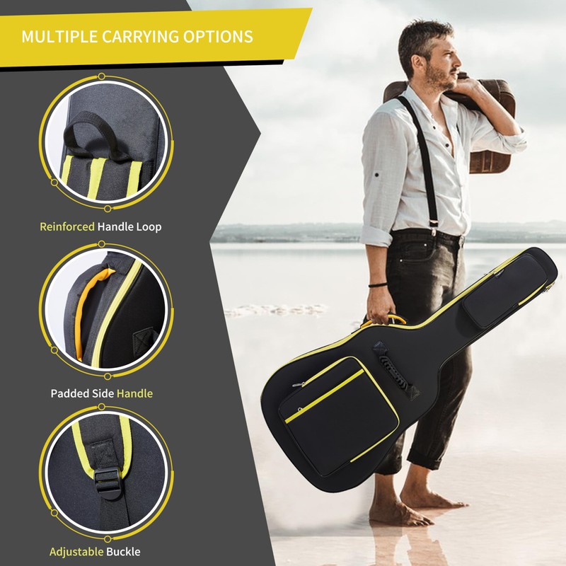 PPOPPO 40/41/42" Acoustic Guitar Gig Bag combines premium protection, versatile portability, and smart design to safeguard your instrument while keeping convenience at the forefront. Crafted with a 600D waterproof heavy-duty nylon exterior, it shields your guitar from rain, spills, and daily wear, ensuring durability even in tough conditions; inside, a 0.35" thick padded layer cradles your guitar, absorbing shocks from bumps or drops during gigs, travel, or practice. Carry it effortlessly with the dual adjustable shoulder strap for backpack-style comfort, or use the padded side handle for quick one-handed lifts—the reinforced front handle adds even more versatility for seamless switching between carrying styles. Stay supremely organized with a 2-pocket design: the large front pocket fits Pads, tuners, documents, pedals, adapters, music stands, music books, and more, while the dedicated neck pocket securely holds Strings, cables, capos, picks, badges, and other small essentials—no more rummaging mid-performance. A dual-way metal zipper ensures smooth, secure opening and closing, and the rubber anti-slip bottom keeps the bag stable on slippery floors to prevent accidental slips. Finished in a sleek black-and-yellow design, this gig bag merges functionality with style, making it the ultimate choice for musicians heading to local venues, weekend tours, or daily practice sessions.