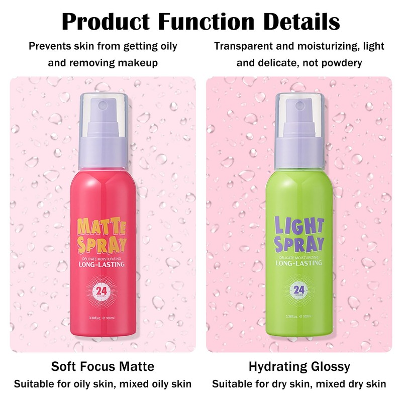 - Setting Spray Make Up Set: The set contains two bottles of setting sprays with different effects, one for a matte, soft-focus matte finish for oily and oily skin, and the other for a glossy, hydrating finish for dry and dry skin