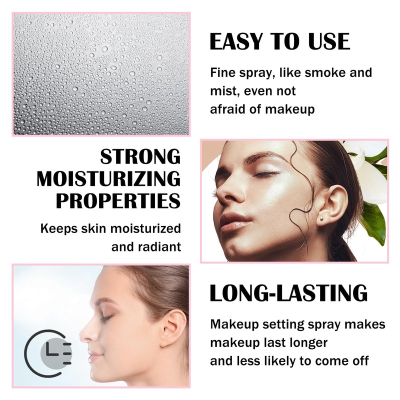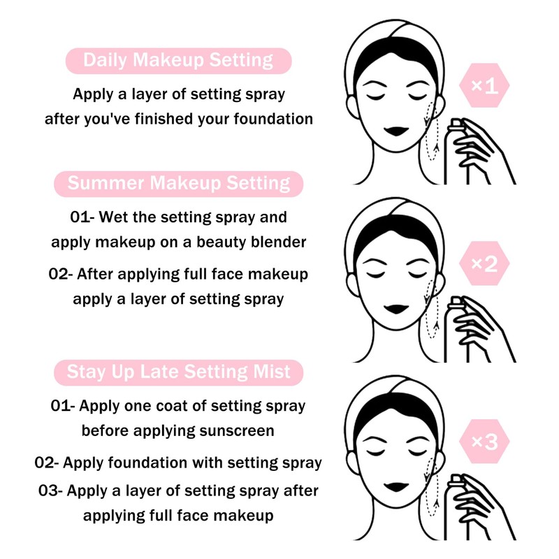 - How to Use: Shake the bottle before use, then close your eyes, press the pump head at a distance of 20 centimeters from your face, spray the spray evenly on your face in a circular motion, and wait for it to form a film, a simple step-by-step process, makeup beginners can also easily manage