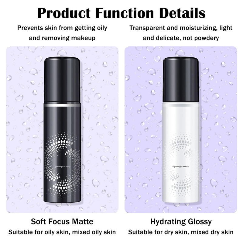 - Setting Spray Make Up Set: The set contains two bottles of setting sprays with different effects, one for a matte, soft-focus matte finish for oily and oily skin, and the other for a glossy, hydrating finish for dry and dry skin