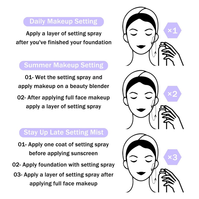 - How to Use: Shake the bottle before use, then close your eyes, press the pump head at a distance of 20 centimeters from your face, spray the spray evenly on your face in a circular motion, and wait for it to form a film, a simple step-by-step process, makeup beginners can also easily manage