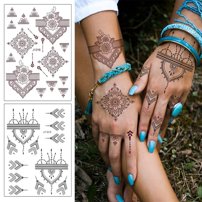 PPVWEY 10 Sheets Henna Tattoos Temporary Henna Stickers 5P Black + 5P Brown Tattoo Stickers Women Body Art Stickers for Wedding Party (5 Brown+5 Black)
