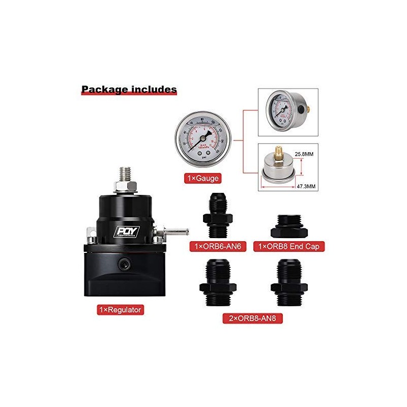 - ✿WHAT YOU GET:1 × fuel pressure regulator, 1 × gauge,2 × -8AN fittings for feed and supply lines,1 × -6AN return line fitting,1 × AN8 end cap(you can cap off one feed if you only need 1 feed)