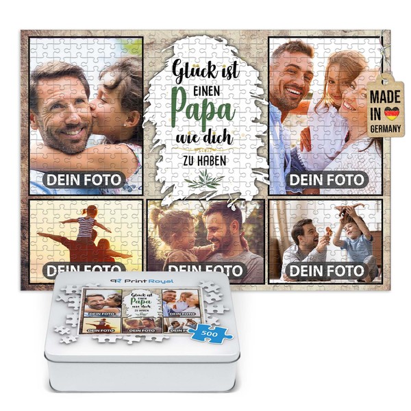 PR Print Royal Photo Puzzle with 5 Photos Print – Glück ist einen Papa wie Dich zu haben – Collage Puzzle Design Yourself for Dad – 500 Pieces Including High-Quality Metal Tin