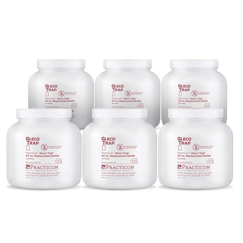 The compact 43 oz. Gleco Trap prevents losing crowns, files, or other small instruments down the sink drain. The 43 oz. size refill saves under sink space. 4” tall. Six bottles per case.