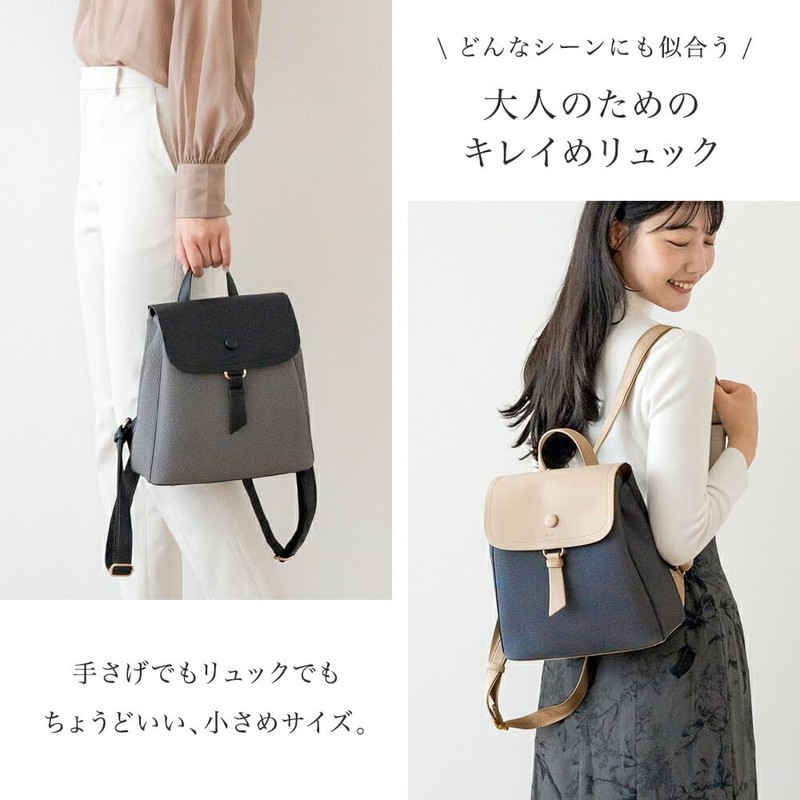 - This is a synthetic leather backpack with a textured embossed and printed finish that looks like a canvas fabric. It has a natural feel that utilizes the good qualities of synthetic leather, such as water, dirt, and scratches, easy to clean, and lightweight. The flap part of the combination color is made of shrunk-like faux leather. Fashionable, muted and beautiful adult colors. When you open the magnetic cover, it has a 3 room type with a magnetic and zipper aori pocket. The main compartment pocket is also convenient. The fluffy and soft texture is perfect for a column design. This is a popular compact and small size backpack