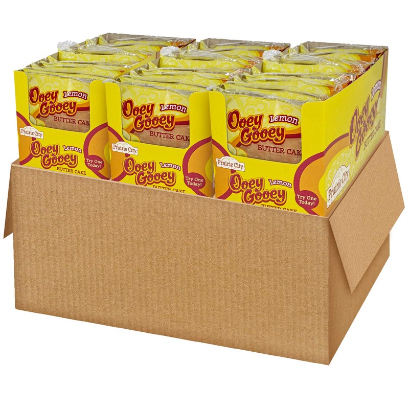 Prairie City Bakery Ooey Gooey Lemon Butter Cake, 2 Ounce -- 60 per case. This decadent two layer treat originated in St. Louis. The bottom layer is a delicious buttery yellow cake, while the top layer is a rich mixture of cream cheese, sugar, and egg. Available in single packs, these delicious treats make the perfect snack. New Lemon flavor really WOWS