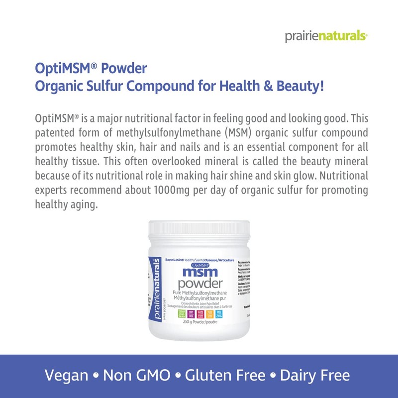 Organic Sulfur Compound for Health and Beauty. OptiMSM is a major nutritional factor in feeling good and looking good. This patented form of methylsulfonylmethane (MSM) organic sulfur compound promotes healthy skin, hair and nails and is an essential component for all healthy tissue. This often overlooked mineral is called the beauty mineral because of its nutritional role in making hair shine and skin glow. Nutritional experts recommend about 1000mg per day of organic sulfur for promoting healthy aging.