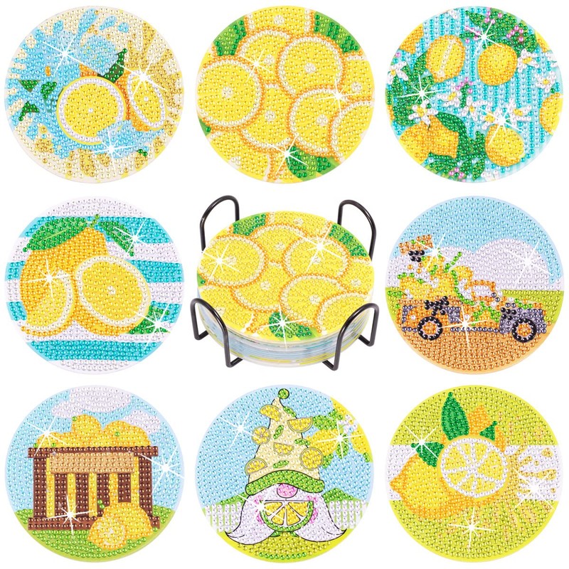 Praise V Do 8Pcs Diamond Painting Coasters Kit with Holder Cork Base, DIY Lemon Summer Coasters Diamond Painting Kit for Beginners, Adults DIY Diamond Art Craft for Housewarming Apartment Bar