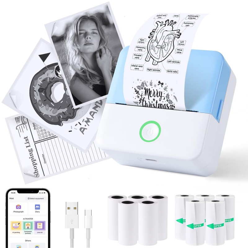 PRAOAHEI Mini Printer, Portable Photo Printer with 10 Rolls of Printer Paper, Bluetooth Label Printer, Thermal Printer for Notes, Photos, Diaries, DIY, Compatible with iOS and Android (Blue)