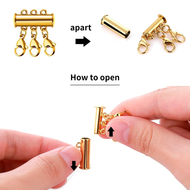 - Safety : This necklace layering clasps is a slide lock. It saves you a lot of time. Once your necklaces are attached, you can take all layered necklaces on and off at the same time by sliding the barrel in or out.