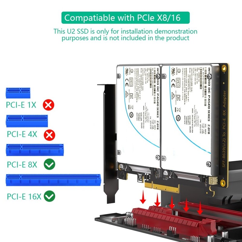- 1. Dual U.2 to PCIe 4.0 X8 Adapter: By installing 2 x U.2 SSD on this PCIe 4.0 X8 adapter, your computer be to access 2 x U.2 SSD at the same time