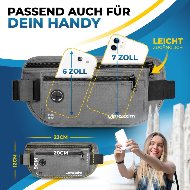 praxxim The Bum Bag for Travel, Theft-Proof with RFID Protection, Extra Flat Bum Bag Can Be Worn Under Clothes, Waist Bag, Travel Bum Bag, Money Belt for Men and Women, gray, Flat fanny pack for men
