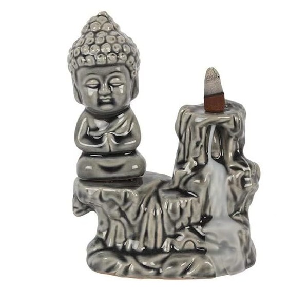 Praying Buddha Backflow Incense Burner - Ceramic Waterfall Design with Calming Smoke Effect (17cm) (Grey)