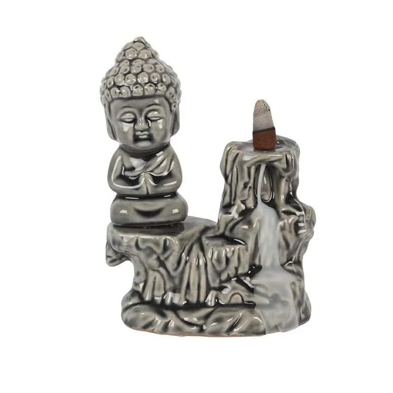 • Tranquil Design: Features a praying Buddha with a backflow incense holder for a peaceful waterfall smoke effect.