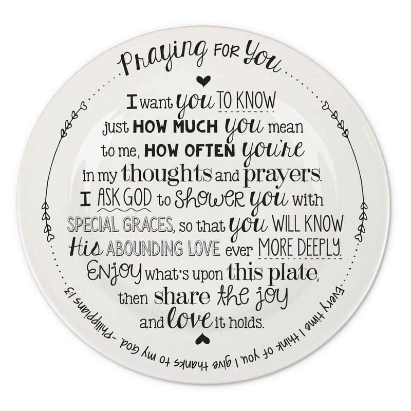 • Features printed sentiment "Praying for you. Every time I think of you, I give thanks to my God. Philippians 1:3. I want you to know just how much you mean to me, how often you're in my thoughts and prayers. I ask God to shower you with special graces, so that you will know his abounding love ever more deeply. Enjoy what's upon this plate, then share the joy and love it hold.