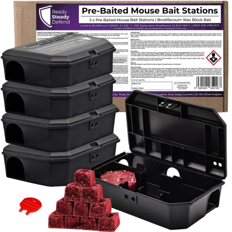 Ready Steady Defend Pre Baited Mouse Boxes (Pack of 5), the ultimate solution for indoor mouse control. These pre-baited mouse boxes are designed to be both effective and easy to use, making them an essential tool for keeping your home or office free from mice.