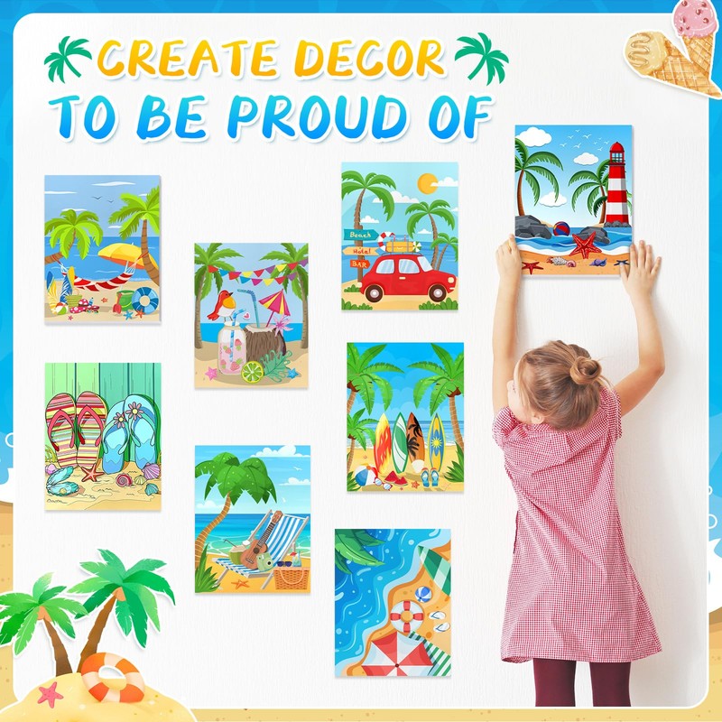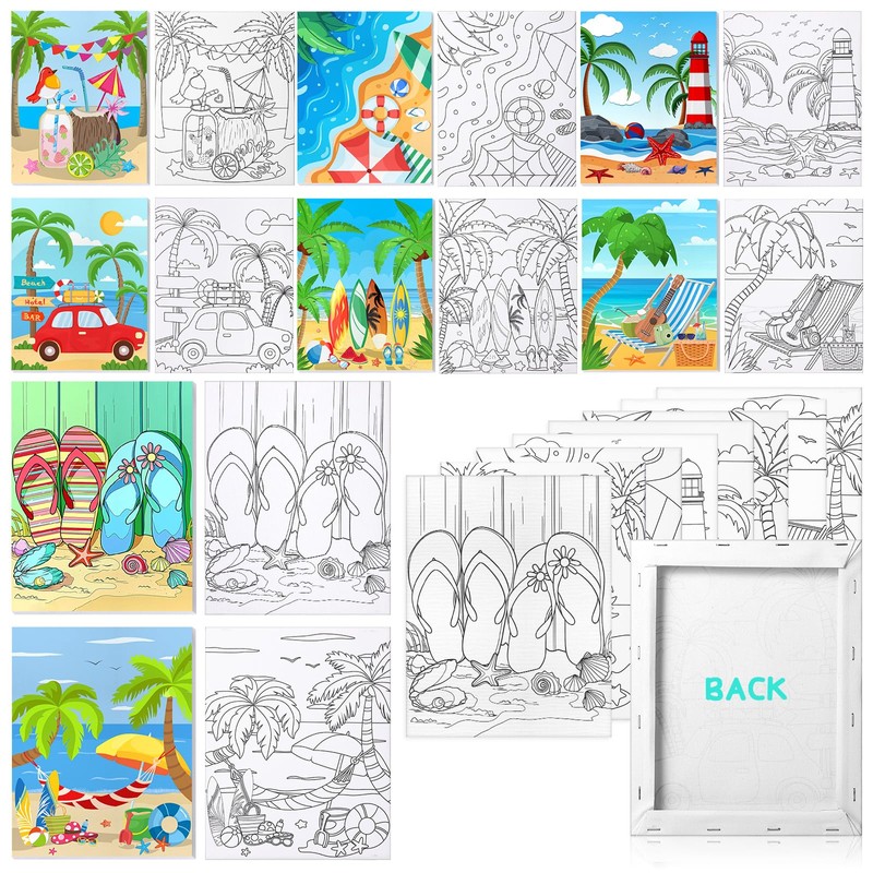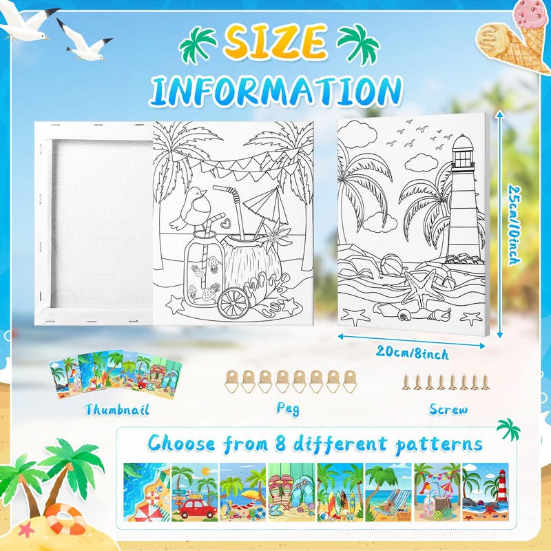 Pre Drawn Stretched Canvas for Painting 8x10 Inch, 8 Pack Pre-Printed Artist Paintings Canvaes Board for Acrylic, Oil Paint & Media, Art Supplies for Hobby Painters, Kids, Beginners (Summer Beach)