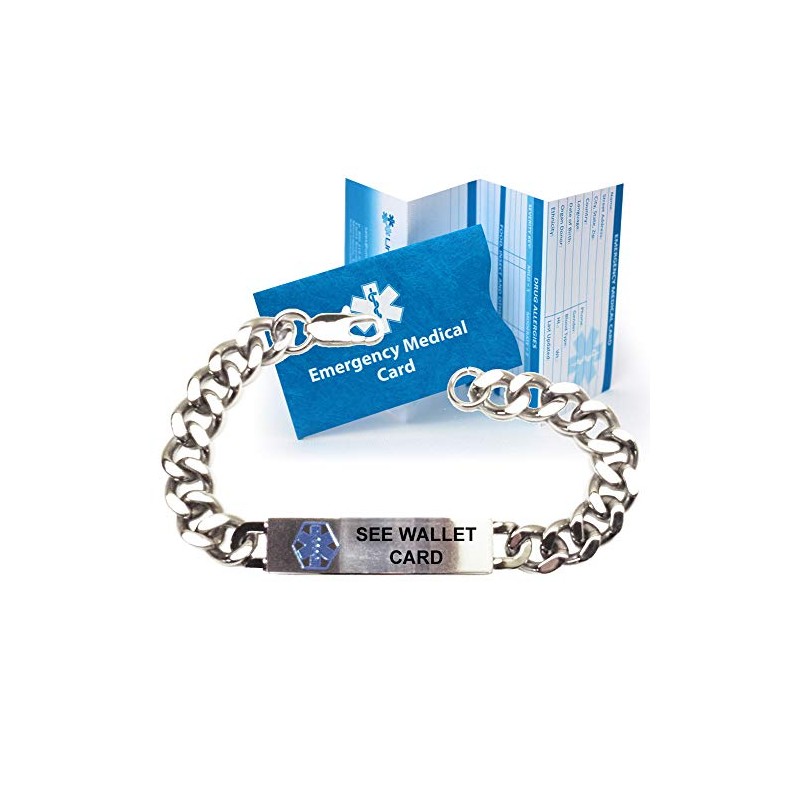 Nothing says “Medical Alert” like our Traditional Curb Link Medical Alert ID Bracelet! Your pre-engraved message will be attention-getting in any emergency with the use of our bold high contrast black lettering on the front engraving plate. The acid etched and blue color filled Star of Life medical alert symbol is easily recognized world-wide advising of an existing medical condition. The Traditional medical alert bracelet boasts a simple yet sophisticated style having a machine-polished stainless-steel finish to achieve a mirror like appearance.
