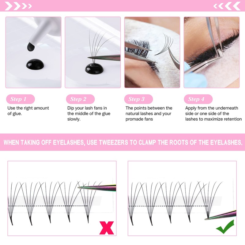 - INVISIBLE POINTY BASE : The Pre Made Fan Eyelash Extensions with the latest technology would not fall apart when take them off lash strip at the base of the fans. The stickiness of the base would leave no clumps of glue on the strip and match perfect with people’s own lashes.