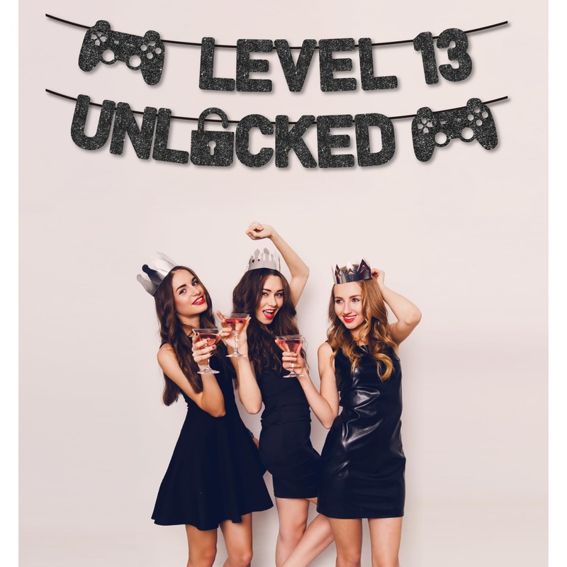 Pre-Strung Level 13 Unlocked Banner - NO DIY - 13th Birthday Banner - Happy 13th Birthday Banner - Black Glitter