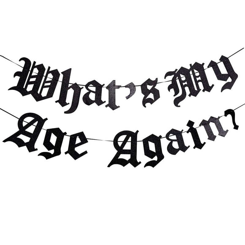 • Whats My Age Again Banner This black glitter birthday banner is perfect for anyone who loves the Gothic aesthetic and wants to celebrate their birthday in style. The banner features an Old English Gothic design with a birthday effect that is sure to make your party an unforgettable night.