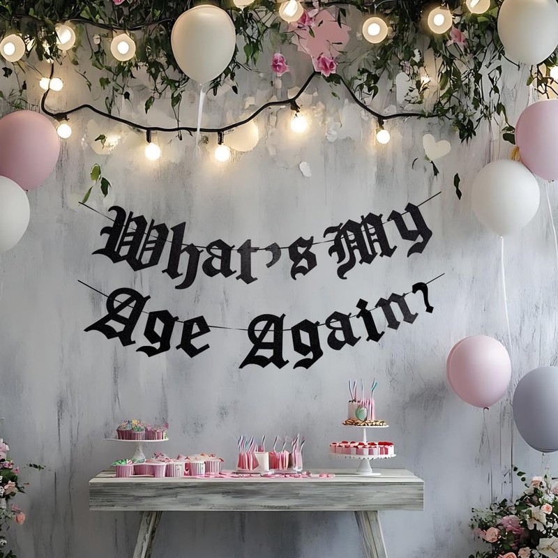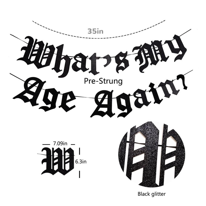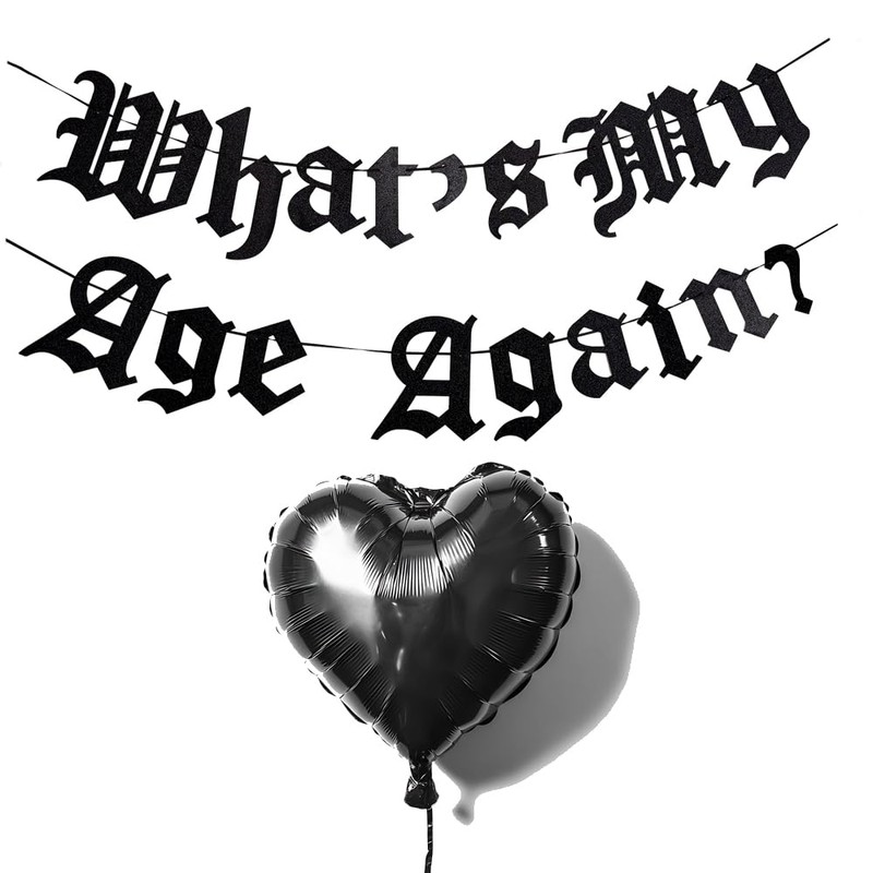 - Whats My Age Again Banner This black glitter birthday banner is perfect for anyone who loves the Gothic aesthetic and wants to celebrate their birthday in style. The banner features an Old English Gothic design with a birthday effect that is sure to make your party an unforgettable night.