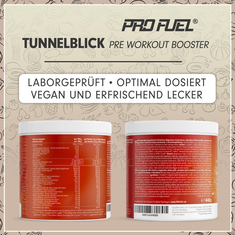 Pre-Workout Booster Tropical Fruits 2 x 360 g - Incredibly Delicious - TUNNELBLICK Training Booster with Citrulline, Beta-Alanine, Taurine, Caffeine & Guarana - Optimal High Dose - Made in Germany, 100% Vegan