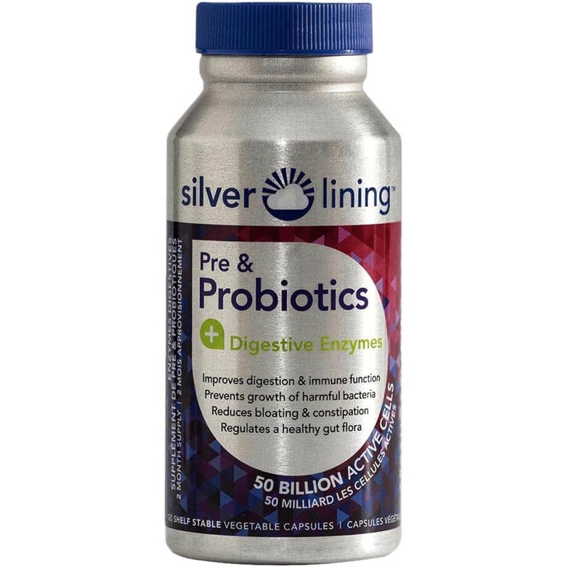 Silver Lining Pre & Probiotics + Digestive Enzymes Supplement Discover the ultimate solution for digestive health with Silver Lining Pre & Probiotics + Digestive Enzymes, an expertly crafted supplement designed to support gut health, boost immunity, and enhance overall well-being. This advanced formula combines prebiotics for women and probiotics for women in one, along with powerful digestive enzymes for men and women, to deliver comprehensive digestive and immune support for all. Packed with 50 billion active cells, including Lactobacillus salivarius, Lactobacillus gasseri, and L. reuteri strains, plus butyrate supplements and digestive enzymes like alpha-amylase, cellulase, and lipase, this supplement supports optimal gut flora balance, smooth digestion, and better nutrient absorption. Ideal for addressing common concerns like bloating relief for women, IBS, and women’s probiotic pH balance, this daily solution promotes vitality and well-being. The shelf-stable formula ensures potency without refrigeration, making it a convenient choice for any lifestyle. Whether you're looking for a womens probiotic, oral probiotics, or pre/probiotic supplements, Silver Lining has you covered. Key Benefits: - Supports gut health with clinically studied probiotic strains, including Akkermansia muciniphila and S. boulardii. - Enhances digestion with premium enzymes for smoother digestion. - Boosts immunity by supporting gut health. - Reduces bloating and eases discomfort for a lighter, more energized feeling. - Convenient shelf-stable capsules with 50 billion active cells for maximum effectiveness. Perfect for: - Women seeking prebiotics and probiotics in one for pH balance and digestive health. - Individuals looking for a butyrate supplement, Lactobacillus salivarius tablets, or a trusted IBS probiotic supplement. - Those in need of a complete probiotic and digestive enzyme supplement for optimal gut health.