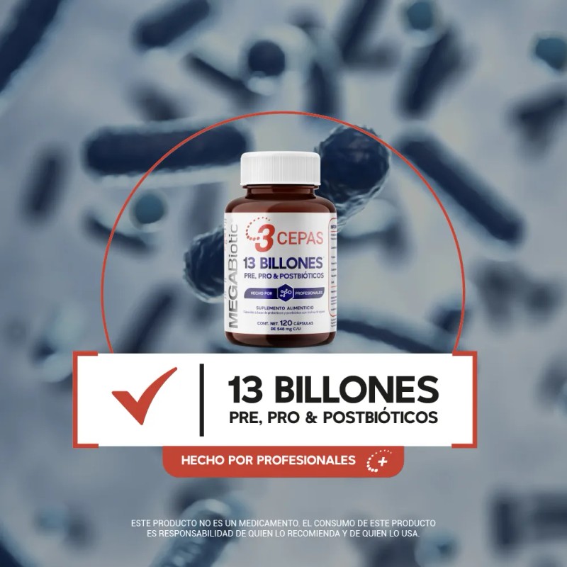 Con 120 cápsulas, Megabiotic ofrece un tratamiento completo para quienes buscan aliviar molestias digestivas, reforzar el sistema inmunológico y mantener un intestino saludable todos los días.