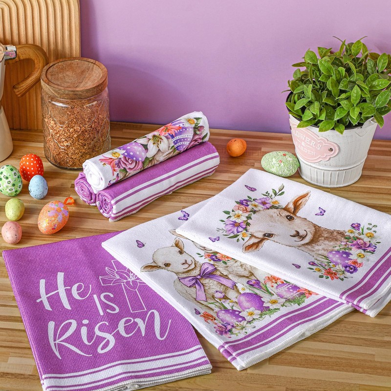 Preboun 6 Pcs Easter Towels Happy Easter Dish Towel Easter Tea Towel He is Risen Easter Decor Cute Sheep Spring Flowers Blessings Dishcloths for Bathroom Home Housewarming Decoration, 16 x 24 Inches