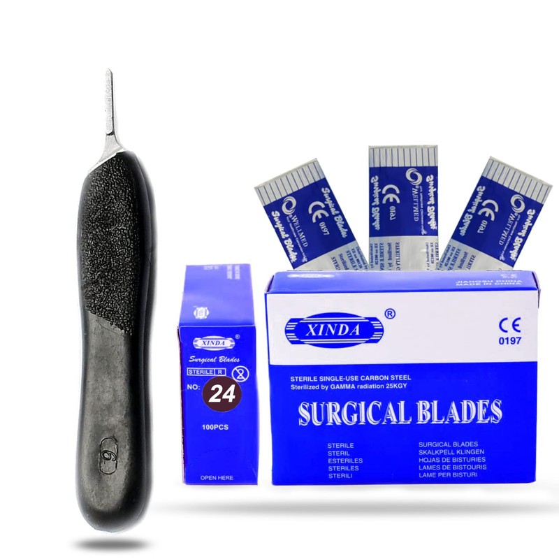 PRECISE CANADA: BOX OF 100 PIECES CARBON STEEL SCALPEL BLADE #24 WITH FREE HANDLE # 6 BLACK COLOR PLASTIC HANDLE