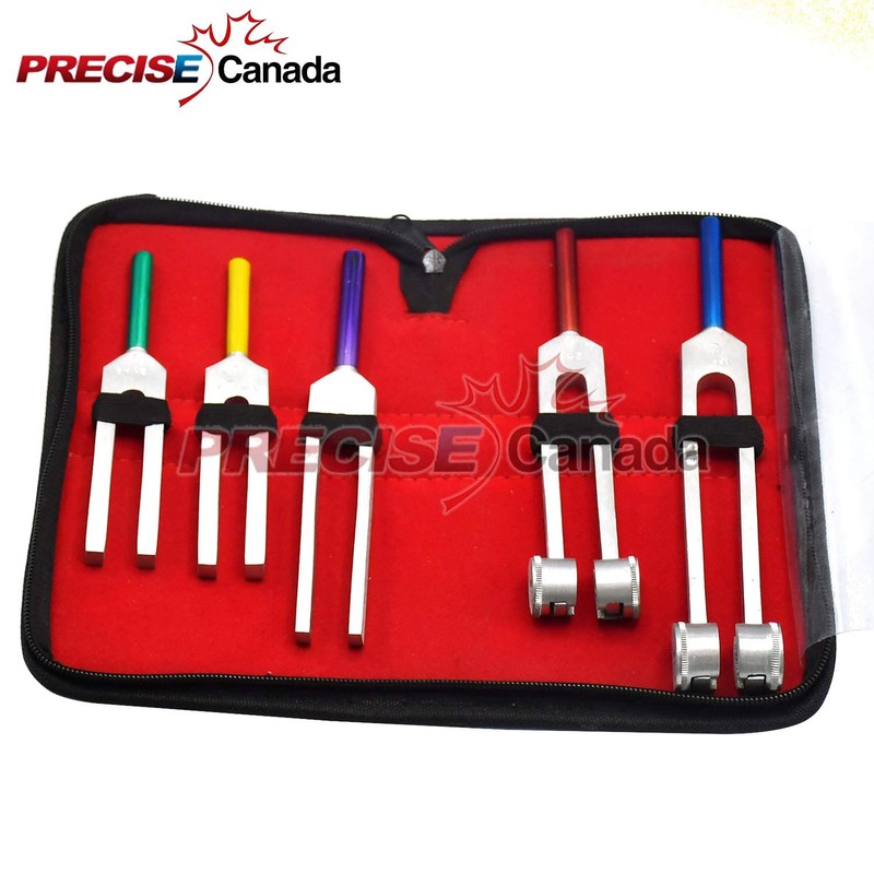 - Precise Canada 5 Piece Medic Sensory Color Coated Handle Tuning Fork Set - Includes 128, 256, 512, 1024, and 2048 cycles plus carrying case
