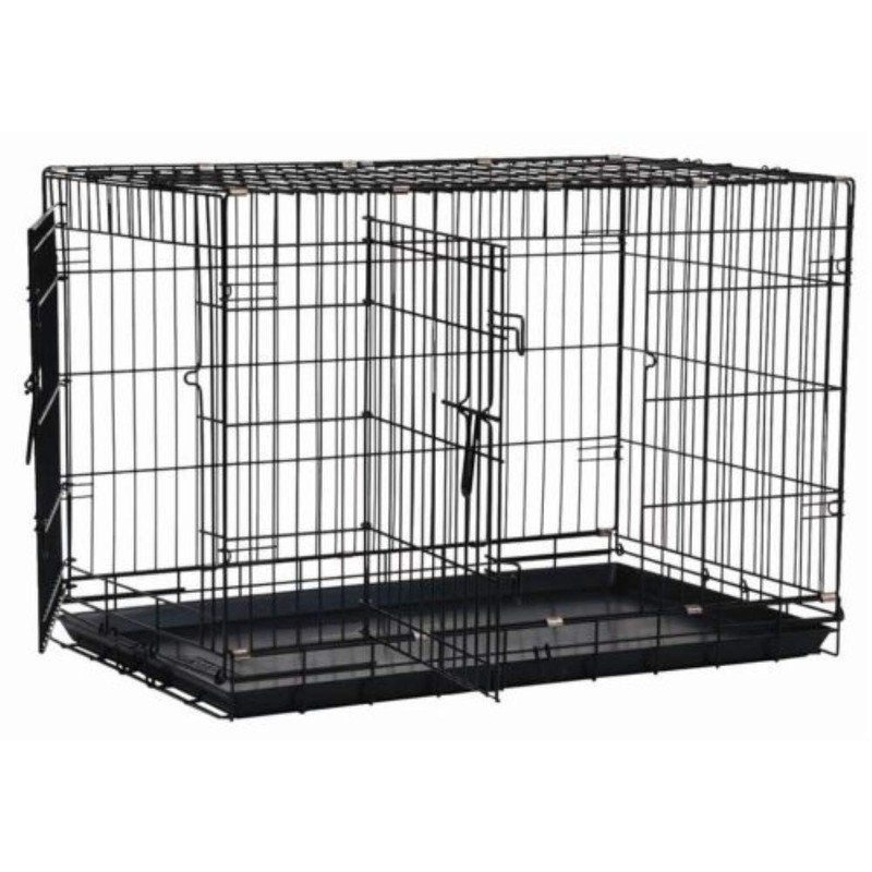 The Petmate 2 Door Great Crate offers separate entrances and a more secure 5-location lock system for a safer and more convenient kennel. The separate entrances on either side of the crate offer easy access and simplify the placement of the crate door. The more secure door and rounded wire corners prevent snags and keep pets safe inside. The crate is made of heavy-gauge wire coated with a rust-resistant black e-coat finish. The crate is easily collapsible to roughly two inches and includes a carrying handle for easy storage and transport. The Great Crate comes with divider panel that can easily be adjusted for pets as they grow. The cage includes a sliding pan that can be easily removed for quick cleaning. The Great Crate comes in 6 sizes: extra small, small, medium, medium large, large, and extra large to accommodate a wide range of dogs.