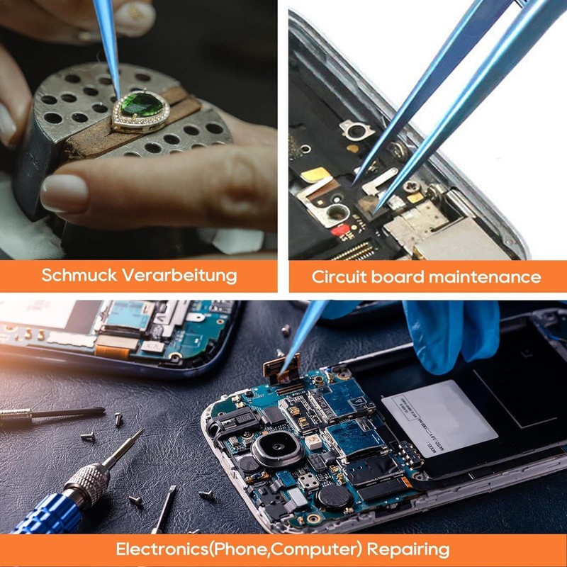 • Versatile Addition: Thanks to their precise design, these tweezers are perfect for holding tiny parts on computer motherboards and digital products. You can also use them for crafting jewelry and repairing circuit boards