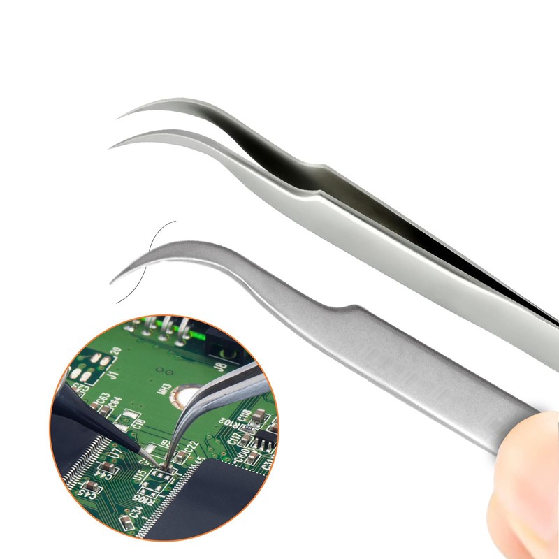 - Precision Tweezers Material: Precision Tweezers. ESD coating for anti-static electricity, and the material is made of stainless steel with excellent acid and corrosion resistance. Precision tweezers have a flexible and strong finish, so your hands won't get tired even after long periods of work
