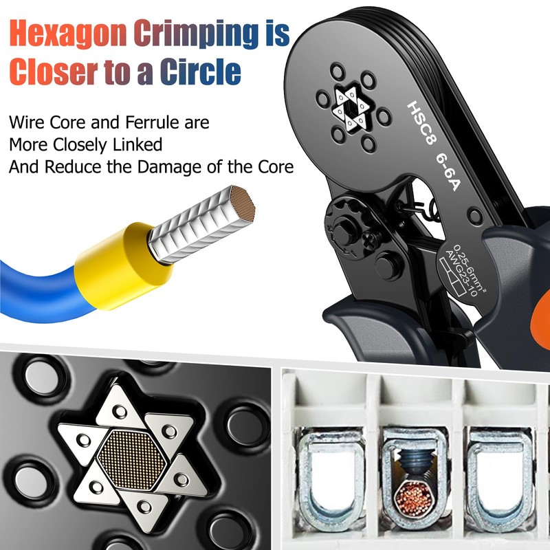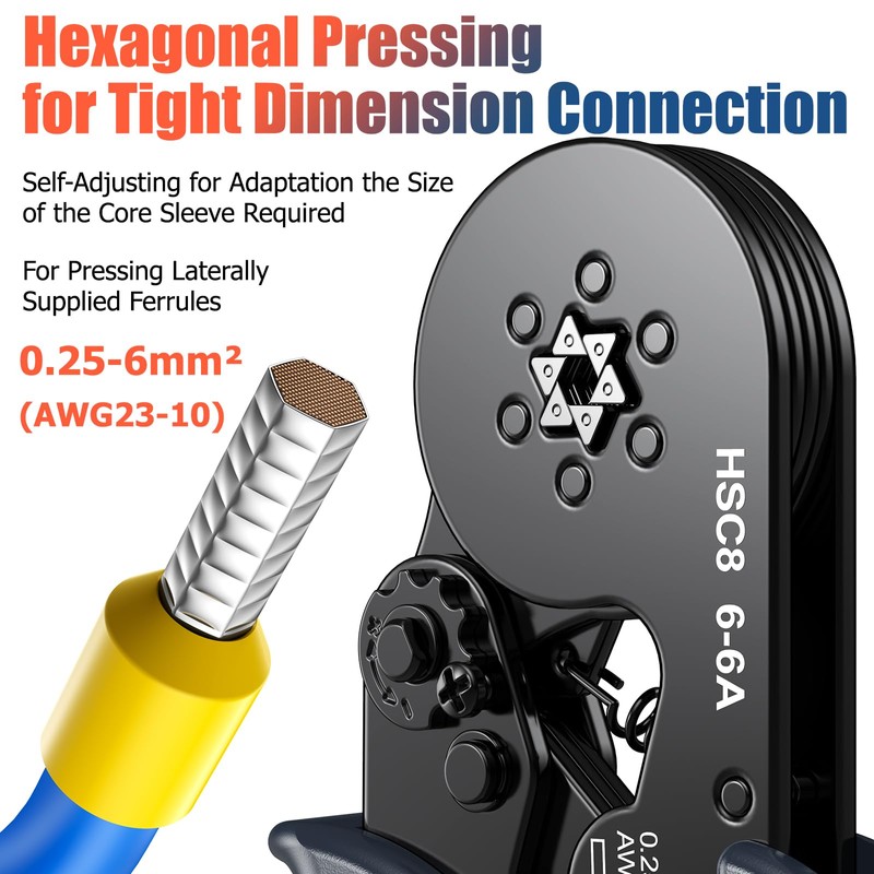 - 【Self-Adjustable Ratchet】For pressing ferrules supplied from side 0.25-6mm²(AWG: 23 ~ 10). If the sleeve is not tightened, you can adjust the pressure ratchet.High quality crimping standard ensures repeatable crimping action