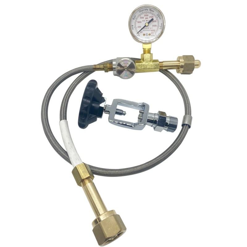 - One side is a CGA-540 (Large Tank) with a 4000 PSI pressure gauge and bleed valve, and the other side is CGA-540 or CGA-870 that screws directly onto your small tank.