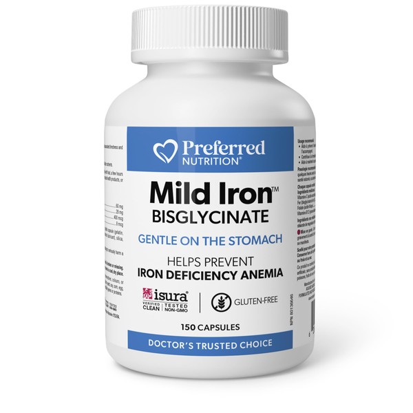 Preferred Nutrition® Mild Iron Bisglycinate 150 Capsules, Stomach-Friendly Iron, Proudly Canadian