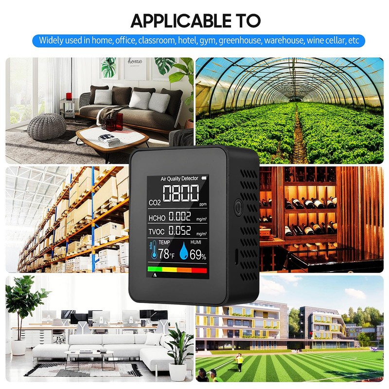 - 【Multi-Function Air Quality Monitor】 This is a 5-in-1 indoor air quality monitor that accurately detects carbon dioxide (CO2), formaldehyde (HCHO), volatile organic compounds (TVOC), temperature, and humidity in real time. It helps you stay informed about the air quality in your living environment at a glance.