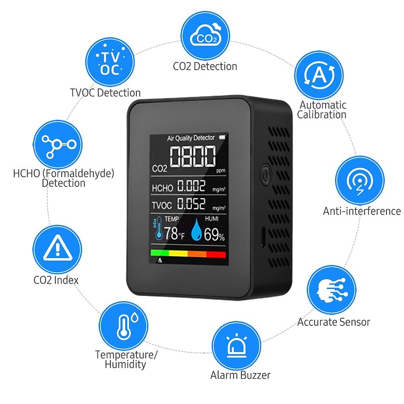 - 【Multi-Function Air Quality Monitor】 This is a 5-in-1 indoor air quality monitor that accurately detects carbon dioxide (CO2), formaldehyde (HCHO), volatile organic compounds (TVOC), temperature, and humidity in real time. It helps you stay informed about the air quality in your living environment at a glance.