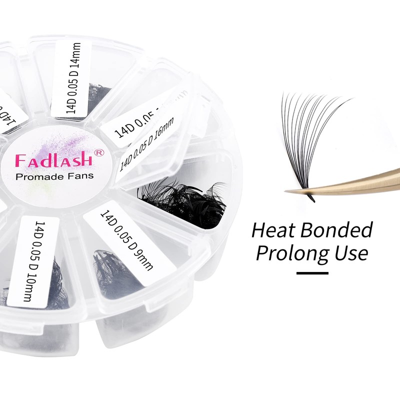 - Budget-friendly Choice: Fadlash 14D D curl; thickness: 0.05mm; mixed length of 9-16mm, our loose promade fans come in packages of 1000 fans(+-2%) , 8.3 times the amount of other 12 rows premade lash fans trays. Fadlash promade fans are the most budget-friendly solution.