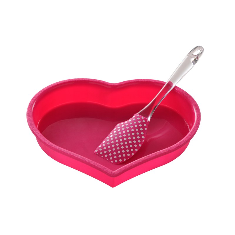 - The cute baking set includes: One silicone heart mould and one spatula