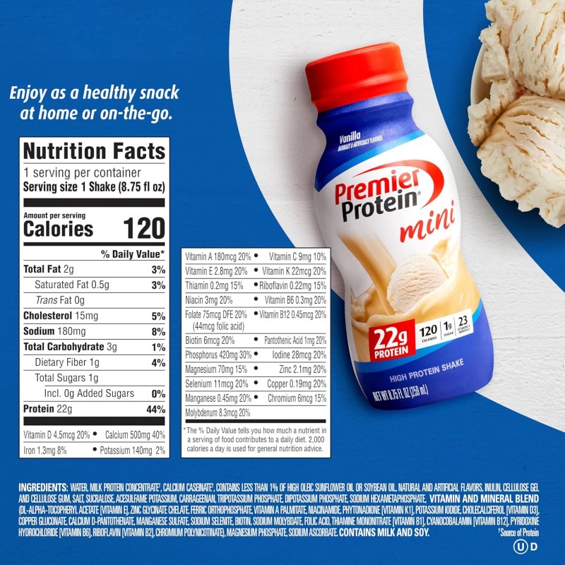 - Smooth and creamy, vanilla flavored protein shake that’s a delectable, sweet treat in a convenient mini sized bottle prefect for an on-the-go snack and keeping you fuller for longer in between meals.