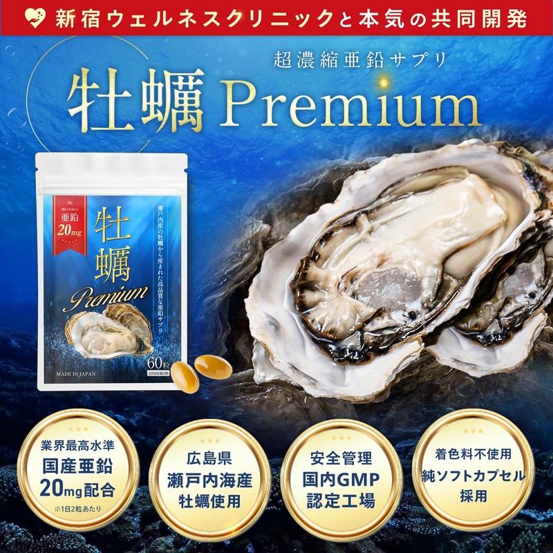 【クリニック監修】 牡蠣Premium 亜鉛サプリ 牡蠣サプリ 亜鉛20mg 高配合 サプリメント 国産 広島産 瀬戸内産牡蠣使用 着色料不使用 ソフトカプセル採用 60粒 30日分