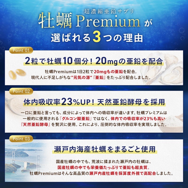 - 【業界トップクラスの配合量】 牡蠣Premiumは1日あたり亜鉛酵母20mgを配合。 業界屈指の配合量で「元気」と「健康」をWでサポートします!