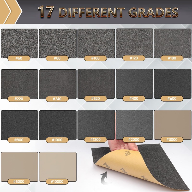 - Premium Wet Dry Sandpaper Sheets: 9"x11" sheets with imported flexible backing paper, oil & water-resistant, preventing curling. Features sharp black silicon carbide abrasive and strong resin adhesive for long-lasting durability in both dry and wet sanding
