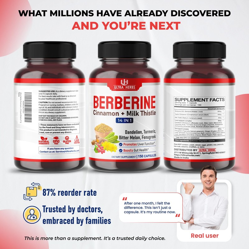 - 14 IN 1 extra strength formula, including: Berberine HCL, Ceylon Cinnamon, Milk Thistle, Dandelion, Bitter melon, Turmeric, Schisandra, Burdock, Fenugreek, Ginger, Artichoke, Licorice, Sea Moss, Black Pepper