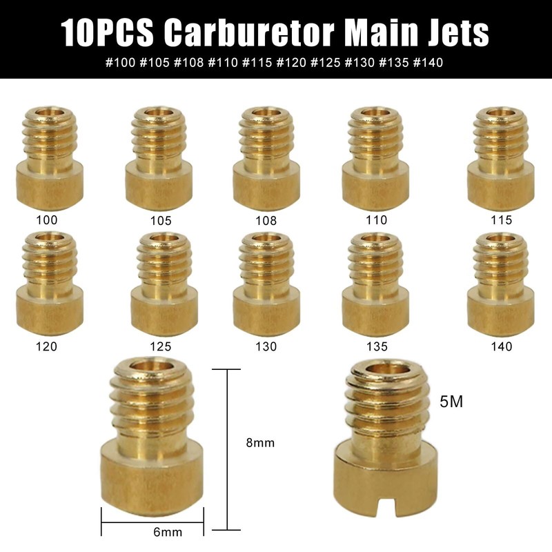 - Size of main jets: 100, 105, 108, 110, 115, 120, 125, 130, 135, 140(for PWK 21mm-34mm); Thread pitch: 4.7 x 2.5 mm; Nut diameter: 5.7 mm; Thread length: 5 mm; Overall length of the hole: 7.9 mm