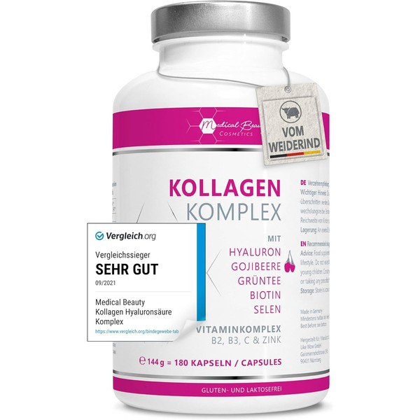 Premium Collagen Hyaluronic Acid Complex – with the Superfood Goji Berry and Green Tea – 180 Collagen Capsules from Grazing Bovine 1000 mg Collagen Hydrolysate, Biotin, Selenium, Zinc, Vitamins C, B2